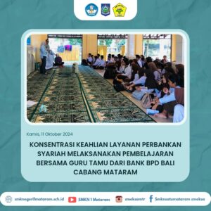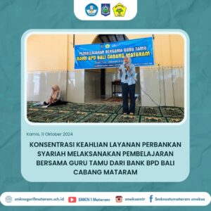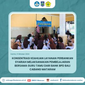 Jum’at, 11 Oktober 2024, Konsentrasi Keahlian Layanan Perbankan Syariah di SMKN 1 Mataram melaksanakan pembelajaran bersama guru tamu dari Bank BPD Bali cabang Mataram dengan tema “Kredit dan Simpanan Pelajar.” Kegiatan ini bertujuan untuk memberikan pemahaman lebih mendalam mengenai produk perbankan khususnya yang berkaitan dengan kredit dan simpanan yang ditujukan untuk pelajar. Para siswa mendapatkan kesempatan untuk belajar langsung dari praktisi industri, memperluas wawasan mereka tentang bagaimana bank mengelola layanan kredit dan simpanan serta pentingnya literasi keuangan di usia muda.