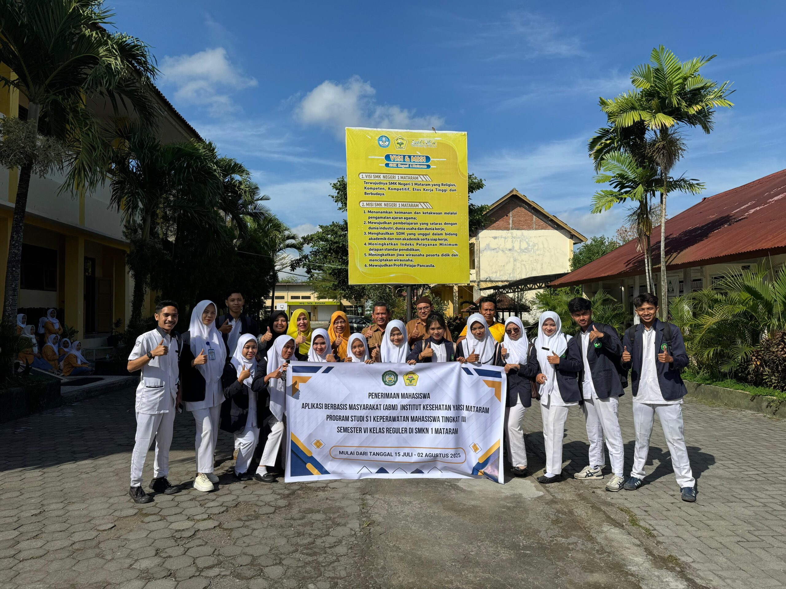 Mataram, 15 Juli 2025 — SMKN 1 Mataram menerima kedatangan 14 mahasiswa Program Studi S1 Keperawatan tingkat III semester VI kelas reguler dari Institut Kesehatan YARSI Mataram dalam rangka pelaksanaan implementasi Aplikasi Berbasis Masyarakat (ABM). Kegiatan ini berlangsung mulai tanggal 15 Juli hingga 2 Agustus 2025 dan dibuka secara resmi melalui acara serah terima yang dilaksanakan di Ruang Rapat Kepala Sekolah SMKN 1 Mataram.